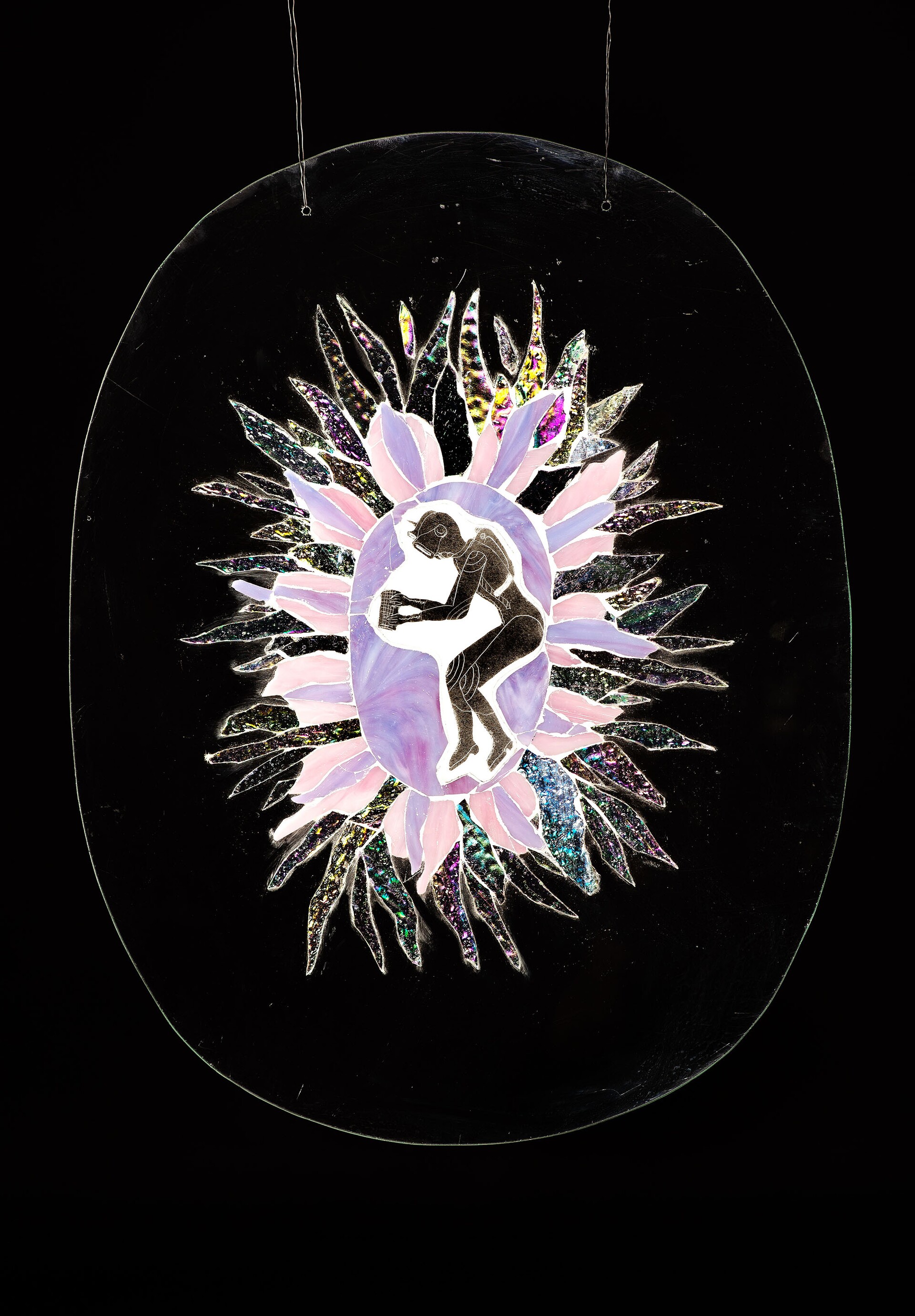 “Disco”, 2024, emalia fusingowa na szkle, mozaika szklana Do jej wykonania zainspirowały mnie światło, ale również swoboda i odwaga w doborze kolorów, którą dostrzegłam w stylistyce plakatów z lat siedemdziesiątych.