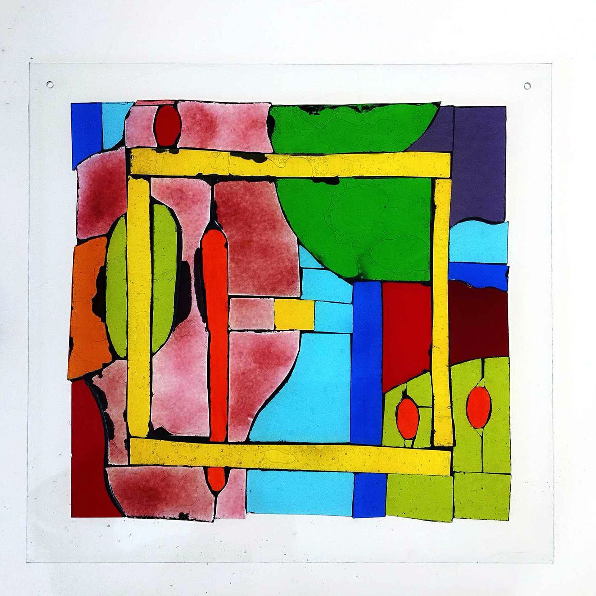 “Radość istnienia”, 2023/2024, emalia, mozaika szklana Praca powstała na podstawie swobodnego szkicu, przy którym eksperymentowałam z kolorami i kształtami. Do stworzenia tej kompozycji zainspirowały mnie emocje, takie jak: swoboda i beztroska, ale również abstrakcyjne kompozycje w stylu Bauhaus.